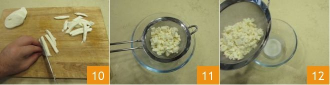 Cut the mozzarella into thin slices of around ¼ inch (½ cm) thick and then into strips of the same size 10. Finally, chop it into very small cubes and place in a colander positioned over a container 11. Leave it like this for at least an hour, so that all the liquid drains from the fior di latte 12.