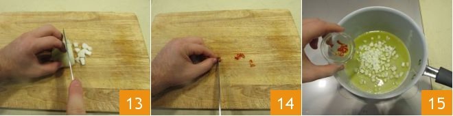 In the meantime, prepare the tomato sauce. Peel and chop the onion 13, slice the chili pepper, remove the stem 14, and cut into thin strips. You might also want to remove the seeds if you want to tone down the spice! Next, pour some oil into a pan, add the chopped onion and chili and fry for a few minutes, stirring continuously to make sure they don’t burn 15.