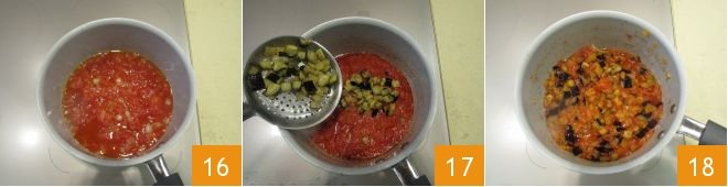 Once the onion has softened, add the peeled chopped tomatoes 16 and cook for at least half an hour over low heat, seasoning with salt to taste. When the sauce is ready, add the fried eggplant 17, allowing the flavor to infuse into the sauce 18 for a few minutes before turning off the heat.