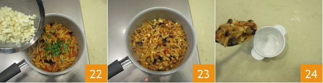 together with the diced fior di latte, setting some aside for the garnish 22. Mix everything together, still with the heat off 23. Fill four 1¼-cup (300-ml) bowls with the mixture 24