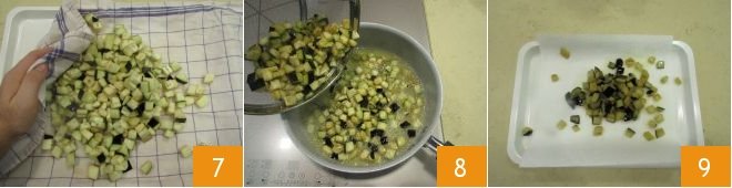 and dry them with a clean cloth 7. Fry in plenty of boiling oil, adding a few cubes at a time 8 to avoid lowering the temperature of the oil too much, as it should remain at 340-350°F (170-180°C). Once the eggplant has cooked for a few minutes, drain it on paper towel 9.