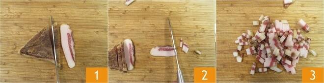 To prepare spaghetti carbonara, start by putting a pot of salted water on the stove to cook the pasta. In the meantime, remove the rind from the guanciale and cut it first into slices 1 and then into strips about 3/8-inch thick 2 3. The leftover rind can be reused to flavor other dishes.