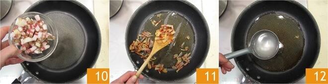 Meanwhile, the guanciale will be cooked 10; turn off the heat and using a slotted spoon, remove it from the pan, leaving the cooking base in the pan itself 11. Transfer the guanciale to a small bowl and set it aside. Pour a ladleful of pasta water into the pan 12, along with the guanciale fat.