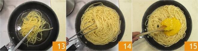 Drain the pasta al dente directly into the pan with the cooking base 13. Toss it briefly to flavor it 14. Remove from the heat and pour the egg and Pecorino mixture into the pan. Mix quickly to combine 15.