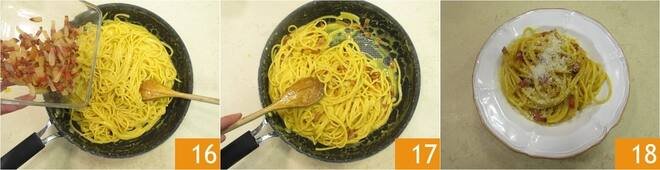 To make it creamy, if needed, you can add a little pasta cooking water. Add the guanciale 16, mix one last time 17, and serve the spaghetti carbonara immediately, adding more Pecorino on top and a pinch of black pepper 18.