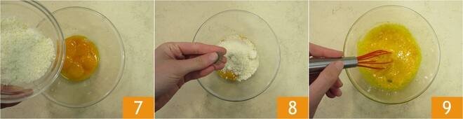 Place the pieces of guanciale in a non-stick pan 4 and brown them for about 10 minutes over medium-high heat, being careful not to burn it, or it will release a strong aroma. Meanwhile, plunge the spaghetti into the boiling water 5 and cook them al dente. In the meantime, pour the yolks into a bowl 6.