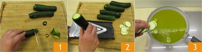 To prepare Spaghetti alla Nerano, start by placing the zucchini on the heat: wash and trim them 1, then thinly slice them into rounds using a mandolin 2. Heat olive oil in a large frying pan, once the oil reaches 150°C (300°F), the ideal frying temperature, immerse the zucchini slices 3 a few at a time to avoid lowering the oil temperature, cook for about 5-6 minutes, enough time to make them golden brown.