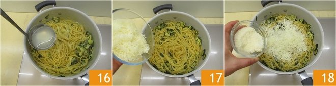 Add a ladleful of pasta cooking water 13 and quickly sauté the zucchini for a moment to soften them slightly and prevent them from becoming dry 14. After approximately 6 minutes of cooking the spaghetti, drain them directly into the pan with the sauce 15, making sure to save the cooking water.