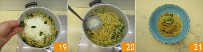 Add a ladle of pasta cooking water, as needed, to continue cooking the spaghetti, stirring them like risotto 16: it will take about 3 minutes. Then turn off the heat. Pour in a portion of Provolone del Monaco, stirring the spaghetti to melt it and create a creamy sauce 17; once it has been absorbed, proceed to sprinkle grated Parmigiano Reggiano 18 and the remaining Provolone.