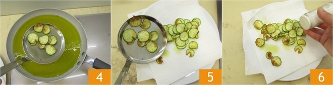Once cooked, drain them using a skimmer 4 and place them on a tray lined with paper towels to remove excess oil 5. As you cook the zucchini, season them with salt 6