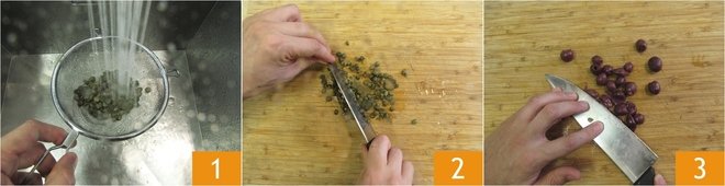 To make spaghetti alla puttanesca, first rinse the capers under running water to remove the excess salt 1, then dry them and chop them roughly with a knife 2. Take the pitted Gaeta olives and crush them by pushing down with the blade of a knife 3.
