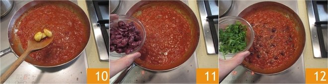 Once the sauce has cooked, remove the garlic cloves 10 and add the crushed olives 11. Season the sauce with the chopped parsley 12.