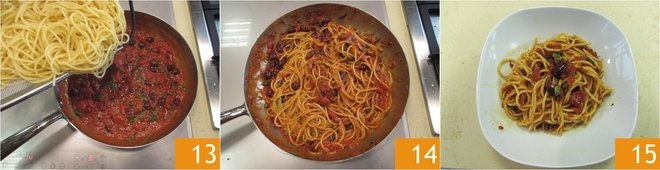 When the pasta is al dente, drain it and pour directly into the pan 13, flipping it in the pan for 30 seconds, just enough time to allow all the flavors to meld together 14. Your spaghetti alla puttanesca is ready to serve piping hot 15!