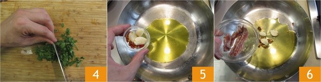 Wash, dry, and chop the parsley 4. Bring a pot of water to a boil to cook the pasta, salting it to taste once boiling. In the meantime, add the oil, whole peeled garlic cloves, chopped dried chili 5, and anchovies 6 to a large frying pan.