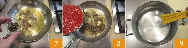 Then add the rinsed capers 7. Brown over medium heat for 5 minutes, stirring often, so the anchovies dissolve and release all their aromas. Next, mash the peeled tomatoes slightly 8 and add them to the pan. Stir with a spoon and cook for another 10 minutes over medium heat. Meanwhile, cook the spaghetti until it’s al dente 9.