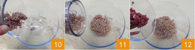 Place the minced pork 10, soft part of bread with mortadella 11, sausage 12