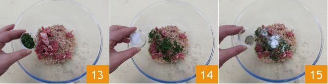 and the parsley 13 in a large bowl. Add salt 14 and pepper 15 to taste.