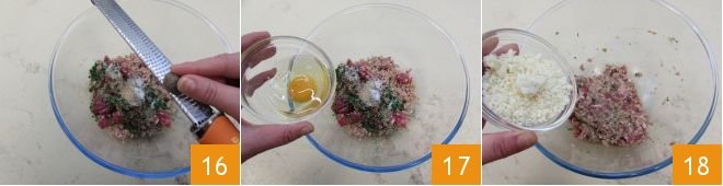 Flavor with the grated nutmeg 16, add the egg 17 and grated cheese 18.