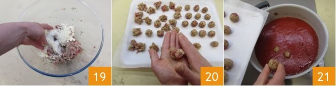Now mix the ingredients thoroughly by hand 19. Cover and leave to rest in the refrigerator for around 15 minutes. Then take the meatball mix and roll into 0.35 oz balls 20, you should make 42 in total. When the sauce is ready, remove the garlic and carefully add the meatballs to the sauce. Leave to cook for another 30 minutes, on a low flame 21.