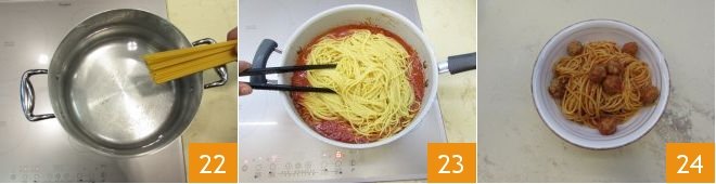 Lastly, bring the water to the boil, add salt and then the pasta 22; drain when firm to the bite and finish cooking it in the sauce 23. Now your spaghetti and meatballs is ready 24.