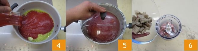 Add the tomato puree 4, then the salt and pepper; leave to cook for at least 40 minutes, with the lid on 5. As the sauce cooks, prepare the meatballs: Place the crust-free stale wholegrain bread in a mixer together with the mortadella 6.