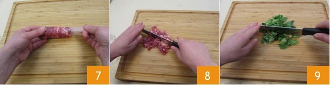 Slice into the sausage with a sharp knife to remove the casing 7 and finely chop it 8. Finely chop the parsley too 9.