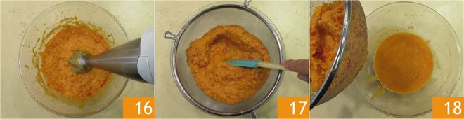 After blending the sauce 16, strain the puree using a spatula 17 to remove the skins and make it smooth and homogeneous 18.