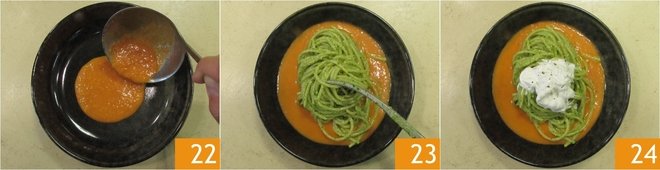 In the meantime, bring a pot of salted water to a boil and cook the spaghetti 19. Drain the pasta al dente in a bowl and add the arugula pesto 20, diluting it with a little cooking water and mixing well to combine 21.