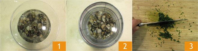 To prepare spaghetti with clams and nduja, start by cleaning the clams. Make sure there are no broken or empty shells, they should be discarded. Then proceed to tap them against the sink or possibly on a cutting board. This operation is important to check for sand inside: healthy bivalves will remain closed, while those full of sand will open. Then place the clams in a colander placed over a bowl and rinse them. Then pour them into a bowl and add plenty of coarse salt. Leave the clams to soak for 2 hours 1. After this time, the clams will have purged any sand residues, rinse them again and drain them 2. Finely chop the parsley 3.