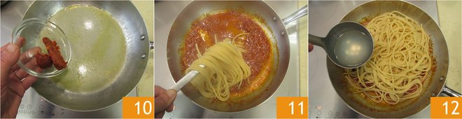 Then pour the clam water into the same pan, add the nduja without the casing 10 and stir to combine. Drain the spaghetti here 11 and continue cooking using a bit of the pasta cooking water 12.