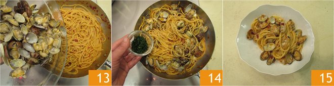 At the end of cooking, add the clams 13 and the chopped parsley 14, a drizzle of oil, and a good grind of black pepper. Now the spaghetti with clams and nduja are ready to be served 15.
