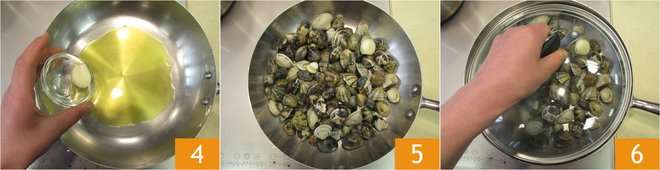 In a pan, heat a drizzle of oil. Then add a clove of garlic 4. Add the clams 5. Close with the lid 6 and cook for a few minutes over high heat. The clams will open with the heat, so shake the pan occasionally until they have completely opened.