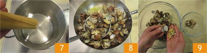 Meanwhile, bring a pot full of salted water to a boil, as soon as it boils add the spaghetti 7 and cook until al dente. When the clams are all open, immediately turn off the heat, otherwise the clams will overcook. Drain them 8, collect the cooking water and discard the garlic. Shell part of the clams and keep others whole 9.