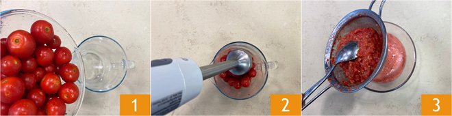 To prepare spaghetti with fresh tomato, basil, and stracciatella, wash and then blend the cherry tomatoes with an immersion blender 1 2. Once you obtain a smooth cream, strain it through a fine-mesh sieve using a spoon 3. Set aside.
