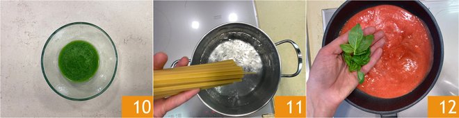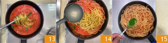 Drain the spaghetti (reserving some cooking water) into the pan with the sauce 13 and only then turn on the stove. Finish cooking the pasta in the pan by adding a ladle of cooking water 14. At the end of cooking, add the basil oil 15 and toss.