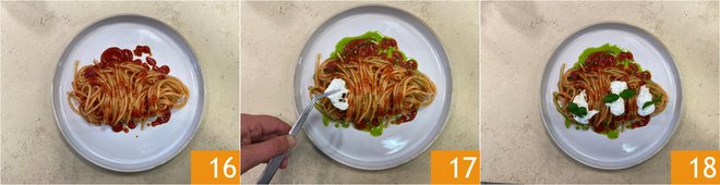 Plate by adding more tomato sauce 16, a drizzle of basil oil, and some dollops of stracciatella 17. The spaghetti with fresh tomato, basil, and stracciatella is ready to be enjoyed 18!