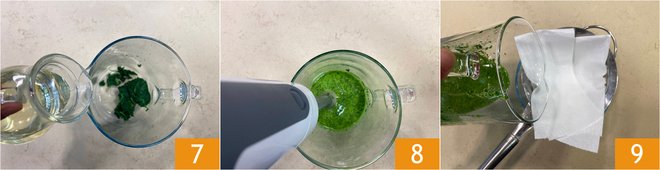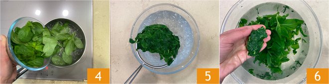 Move on to the basil oil: blanch the leaves for 30 seconds in boiling water 4, then drain them and place them in a bowl with ice water 5 so that they retain their bright color. Now squeeze the leaves 6.