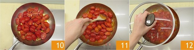 Now add the tomatoes 10. Stir and cook on high heat for 5 minutes. Add a pinch of salt and crush them with a wooden spoon 11; in this way, they will release all their juice. Cover with a lid 12, lower the heat, and cook for another 15 minutes.