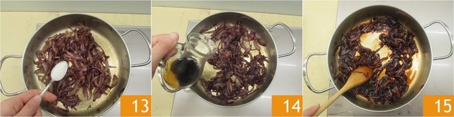 As soon as the onions are well softened, add the sugar 13. Deglaze with balsamic vinegar 14 and cook for another 15 minutes, until they are well caramelized, soft, similar to a jam 15.