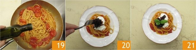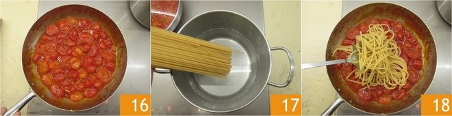 At this point, the sauce will also be ready: the tomatoes should be very juicy 16. Cook the spaghetti in plenty of boiling salted water 17. Keeping aside the cooking water, drain the pasta very al dente, about 4 minutes before, and transfer it to the sauce. Finish cooking by adding the reserved cooking water.