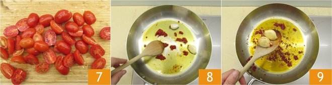 Once you have cut them all 7, prepare the sauté. In a large pan, pour a drizzle of oil, 2 previously crushed garlic cloves, and the tomato paste 8. As soon as the garlic is well golden, remove it 9.