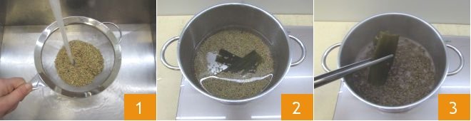 To prepare spaghetti with veggie balls, start by rinsing the lentils under cold running water 1 (there's no need to soak, although you may prefer to do so, for around 2 hours: this will shorten the cooking time) and cook for the length of time indicated on the packet, in unsalted water, with a square of kombu seaweed 2. Towards the end of the cooking time, when tender, add salt to taste and remove the seaweed 3.