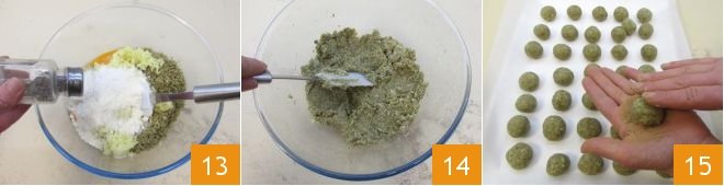 Add salt and pepper to taste 13 and stir thoroughly: you'll need to obtain a mellow and rather firm consistency 14 that will be easy to work with. Now roll it into balls: dampen your hands and form the balls, using around half an ounce of dough for each one. As you prepare them, place the balls on a tray lined with parchment paper 15.