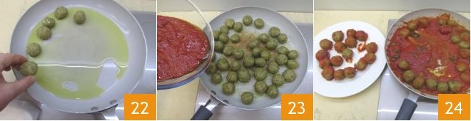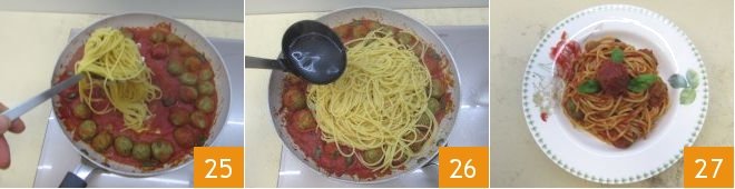 While the spaghetti cooks, heat a drizzle of oil in a capacious pan, when hot add the balls 22 and brown them for 2-3 minutes, shake the pan so that they become golden on all sides. Pour the tomato sauce over the balls 23 and leave to flavor for a minute. Now remove around 1/3 of the balls from the pan and leave them to one side for use when arranging onto dishes 24.