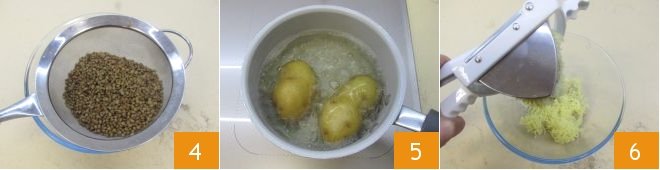 Drain the lentils in a colander over a basin, to remove all access water 4. In the meantime, boil the whole potatoes for around 25-30 minutes (cooking time will depend on the size of potatoes used) 5. Leave them to cool just enough so that you can peel them; use a potato masher to mash them when still hot 6, and leave to one side.