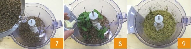 Once the lentils are thoroughly drained and cooled, place them in the mixer 7, add the parsley and peeled garlic 8. Blend to obtain a fine mixture 9.