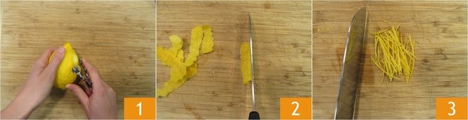To prepare spaghettoni with anchovy sauce, pistachios, and candied lemon, start with the latter. Wash the lemons and peel them using a potato peeler, avoiding the white part 1. Now, with a knife, cut the peel into thin strips 2, aiming for uniform thickness and length 3.