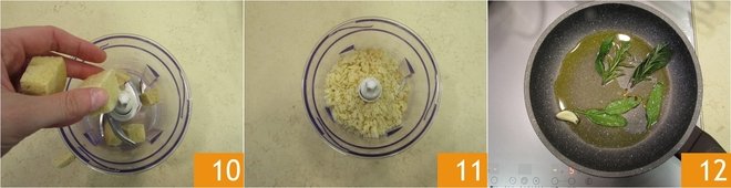 Now prepare the crispy bread. Pour the stale bread into a mixer 10 and blend until you get coarse crumbs 11. In a pan, add a drizzle of oil, a clove of garlic, rosemary, sage, dried chili pepper, and bay leaf 12.