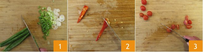 To prepare the spaghetti start by cleaning and slicing the spring onions and half of the green part 1. Now remove the seeds from the peperoncino 2 and cut the cherry tomatoes into four pieces 3.