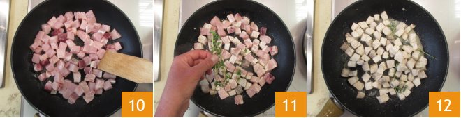 Brown on a high flame for around 5 minutes 10 and add the thyme when nearly done 11; as soon as the cooking sauce evaporates, leave the swordfish to one side 12.